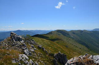 2 : En premier plan la crête de la montagne de Couspeau avec les rochers de La Cognette et le Pré du Boeuf puis en arrière-plan les Hauts Plateaux du Vercors et les sommets du Dévoluy