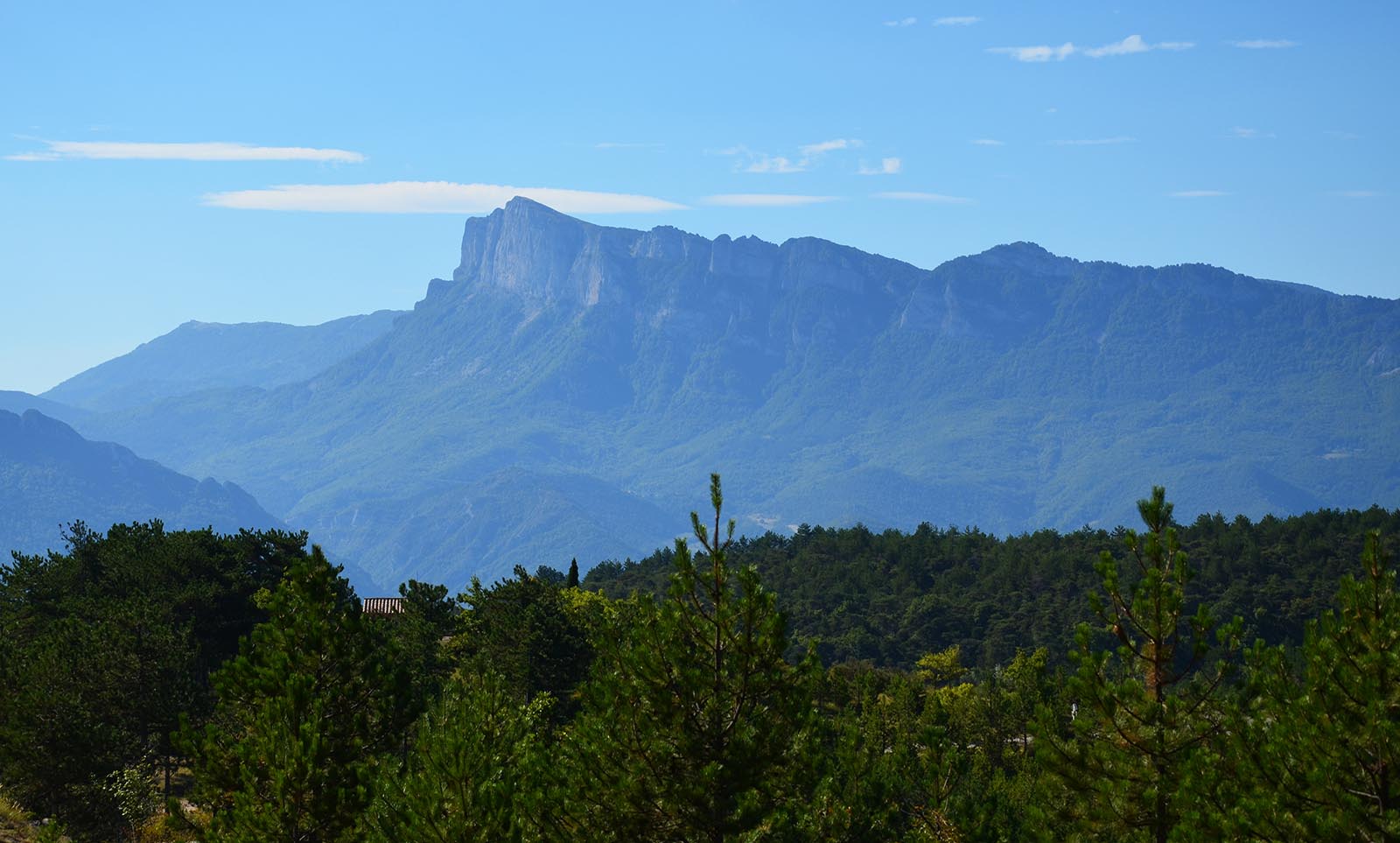A côté de l'église, du sommet de la colline, on a une belle vue sur la vallée de la Gervanne avec le rocher du Vellan à l'horizon